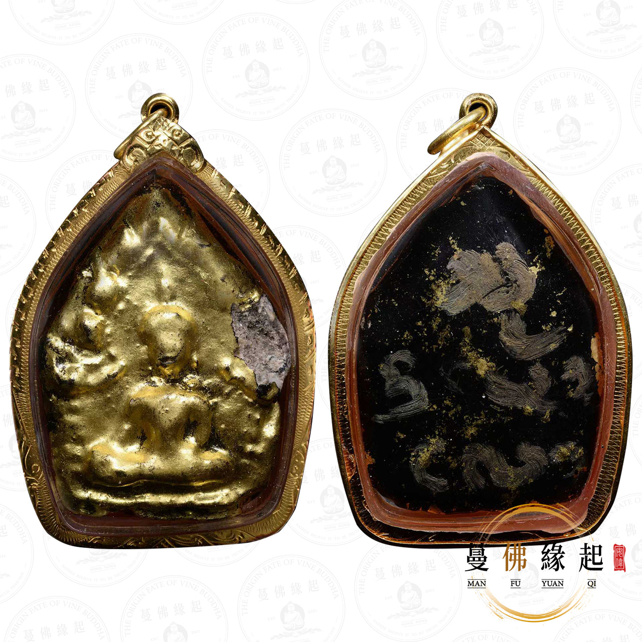 此尊為特別版,上金漆黑漆,帶手寫符,使用婆難弄/古巴磐石/難當三位師傅共同製作的路過打碎製作,其他材料已經無從考究,但可以肯定的是有非常高含量的派粉,全部製作100尊左右,普通版整體為白色泛黃,可以不透過放大鏡直接看到派粉,而這尊特別版,也可以透過右側的破損部位直接看到材料。