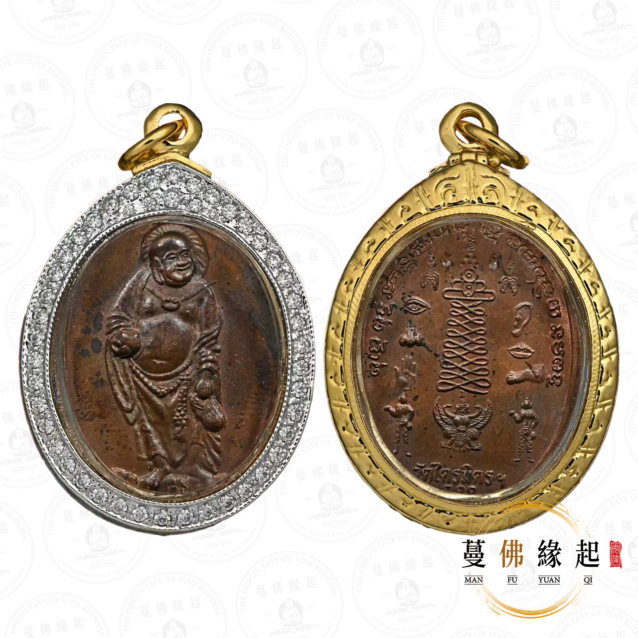 此為師傅2536年站立彌勒,手提錢袋,模樣非常像師傅本人,背面為「彌勒六根」形象。
