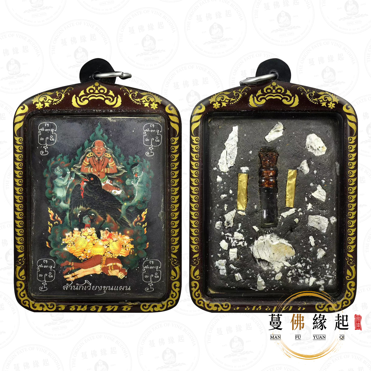 阿贊wiang 烏鴉loccket,這是他自己用的版本,也就是師傅版,外殼上寫上了“倫娜麗”這是布阿贊伴瑪的姓氏,這也是他自用物的特徵之一,師傅還讓我仔細看背後的鐳射印,已經有一定程度的磨損,這是因為他經常佩戴的。